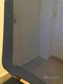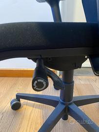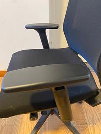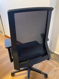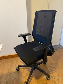 Seduta operativa mod. ENA con schienale alto in rete nera e supporto lombare regolabile, con meccanismo sincronizzato, sedile con regolatore di profondità. Girevole con elevazione a gas, braccioli a T regolabili 4D altezza, larghezza, profondità con superficie soft touch, base nera a 5 razze in nylon con con ruote gommate piroettanti a doppio battistrada d. 65 mm.