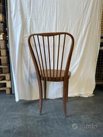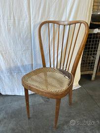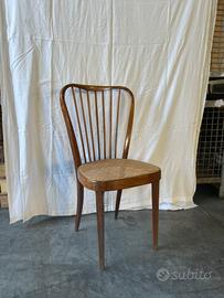 Elegante sedia vintage anni '50-'60, realizzata in legno massello curvato con caratteristico schienale a stecche sottili, tipico del design modernista dell'epoca. La seduta è in paglia di Vienna intrecciata, originale e in ottime condizioni, che dona leggerezza e fascino artigianale. Linee morbide, stile senza tempo, perfetta per ambienti retrò, bistrot o interni moderni con un tocco caldo e autentico. Purtroppo una delle sedie ha la seduta strappata quindi il prezzo è di 40€ la sistemazione della seduta posso evitare effettuarla io