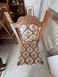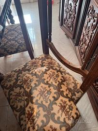 Set di 6 sedie originali anni ’60, realizzate in legno massello con seduta e schienale imbottiti in stoffa ricamata dal motivo classico.