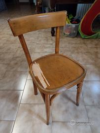 Set di 5 sedie italiane vintage in faggio tipiche degli anni '70, usate come sedie da taverna/osteria. Solida struttura artigianale in legno, con segni di usura, da restauro oppure ottima base per utilizzo creativo.