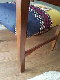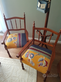 Sedie poltrocine vintage completamente restaurate, struttura in legno perfetta, per la tappezzeria è stato usato un patchwork di stoffe, sui toni del giallo e blu con applicazioni cucite a mano, il prezzo è inteso per la singola