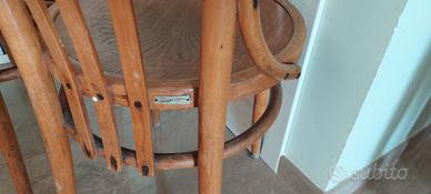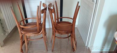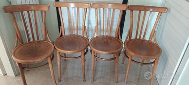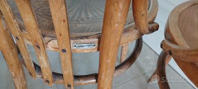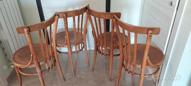 Vendo elegante set di 4 sedie vintage in legno di Giugliano & Fratelli (Potenza), realizzate nello stile classico Thonet. Le sedie presentano una seduta rotonda finemente decorata con motivo floreale intagliato e schienale con stecche verticali curvate, che conferiscono comfort e un tocco di eleganza senza tempo.