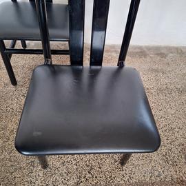 Sedie da pranzo Zea disegnate da Annig Sarian per T70 e prodotte in Italia negli anni '80. In ottime condizioni generali. La struttura in legno massello laccata nera presenta alcuni graffi e opacità. La seduta originale in vinile nero è stata completamente rinnovata ma presenta alcuni lievi segni di usura (vedi foto).