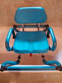 Sedile girevole con schienale e braccioli imbottiti. Il sedile vasca può essere ruotato a 360° in quattro posizioni da 90° per facilitare l’accesso alla vasca a persone con mobilità ridotta. I braccioli si sganciano e si sollevano per consentire più agio nel lavaggio