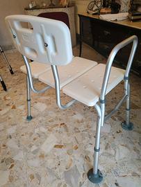 Sedile per vasca da bagno per anziani, con bracciolo e poggia schiena. Totalmente regolabile in altezza e con supporti a ventosa per un blocco sicuro. Struttura in alluminio, molto resistente e leggera, e PVC (bracciolo e poggia schiena). Usato pochissimo.