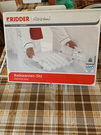 Oggetto nuovo in scatola originale trattasi di un sedile facilmente applicabile alle sponde della vasca da bagno per consentire una facile e sicura doccia alle persone anziane , si monta in 2 minuti e sopporta sino a 150KG . Prezzo regalo solo 18 euro anziche 52