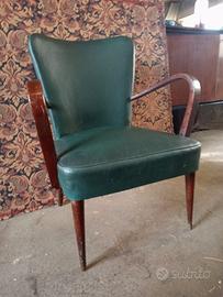 Poltroncine anni 50 in pelle verde . Braccioli in legno curvato e piedini conici . Targhette con numeri di produzione e marchio produttore. Imbottitura in buono stato, da rivedere la lucidatura. Posso effettuare un restauro professionale previo accordi.
