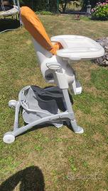 Seggiolone regolabile in più altezze e reclinabile per la nanna. Vassoio con doppio ripiano per facile pulizia e uso gioco/pappa. Presente la retina portagiochi sotto.