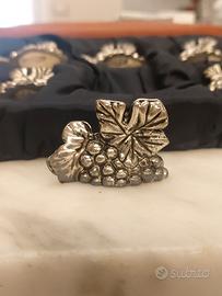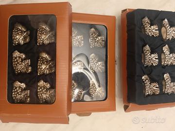 Tre scatole ciascuna da sei segnaposto a grappolo d'una. Realizzati in lega d'argento, non argentati. Questo significa che sono inalterabili. Ogni segnalino presenta una fessura in cui inserire il bigliettino col nome dell'ospite. Ciascuna scatola costa euro 40. Due scatole euro 75; tutte e tre euro 110 con cartoncini in omaggio. Pagamento e spedizione esclusivamente tramite tutto Subito.