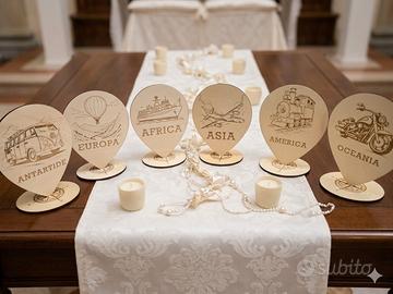 Un allestimento elegante e suggestivo che celebra il fascino del viaggio attraverso sei continenti, ognuno rappresentato da un segnaposto in legno inciso con un mezzo di trasporto simbolico. 6 icone – dal furgoncino vintage all’aeroplano, dalla nave al pallone aerostatico – guidano gli ospiti in un percorso immaginario tra terre lontane. Aggiungi un tocco di avventura e fascino al tuo prossimo evento o alla tua casa con questo esclusivo segnaposto a forma di pin di mappa. Perfetto per matrimoni, eventi tematici o cerimonie ispirate all’avventura e alla scoperta. Sulla base circolare è incisa con una bussola e i punti cardinali. Perfetto per matrimoni a tema viaggio, eventi, o come regalo unico per gli amanti dei viaggi su strada. Misure 14x19cm Prodotto artigianale