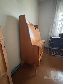 L’anta a ribalta, perfettamente funzionante, cela un pratico vano scrittoio con scomparti interni e cassetti, ideale per organizzare documenti o piccoli oggetti.