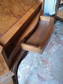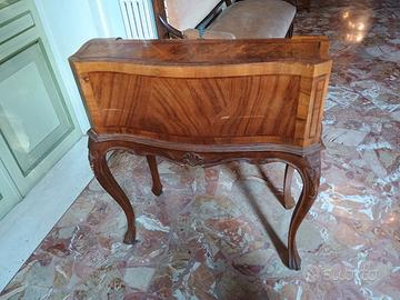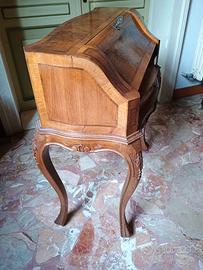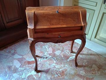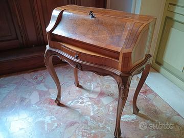 Scrittoio stile Luigi Filippo retto da gambe mosse e intagliate presenta fascia con doppia mossa e cassetto. Anta a ribalta impiallacciata radica quadripartita. All'interno due cassetti e due vani Misure 80x80 profondità 40/55
