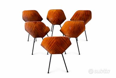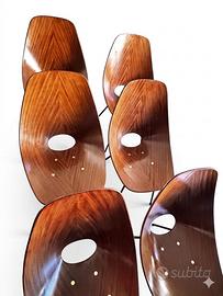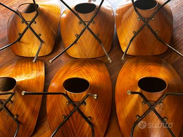 Sei sedie originali "Medea" di Vittorio Nobili (1955), per fratelli Tagliabue-Torino, marchiate a fuoco. Le Sedute sono in multistrato curvato, essenza palissandro e struttura in metallo . Il set è gia' lucidato a gommalacca stesa tampone, in impeccabile stato di conservazione e originale in ogni parte, dalle viti ai gommini, pronto da utilizzare. Non si segnala alcun danno, imperfezione nè segno di usura, essendo in condizioni praticamente pari al nuovo . Possibile visionarle a Vigevano e spledirle e consegnarle in buona parte del Nord Italia.