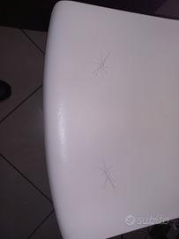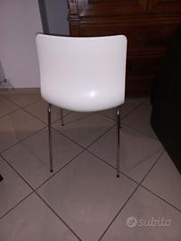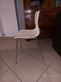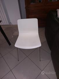 sei sedie 12 anni di età riparate per difetto di fabbrica. in foto vedete la seduta prima e dopo la riparazione con quattro bulloni a testa tonda liscia. ora sono solide. segni di usura consistenti in micro crepe come "ragnetti" sulla seduta come da foto. altezza 80, seduta 47, larghezza 49, profondità 45. vendo un blocco 30 euro, oppure 5 euro l'una. ritiro a Vasto previa visione. non spedisco.