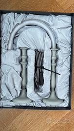 Un continuum dove due candelieri diventano uno solo, collegati da una curva di luce: Marcantonio fa della candela bastone una sorgente di illuminazione stessa, con una forma grafica e sinuosa, dove inizio e fine si rincorrono. Un tocco contemporaneo per un oggetto dal gusto classico.