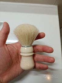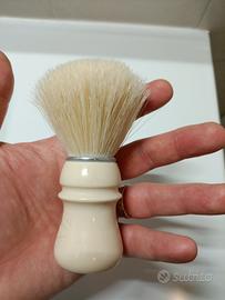 USATO POCHISSIME VOLTE COME NUOVO Il Semogue Owners Club (SOC) C5 con ciuffo in setola di maiale è la quintessenza del pennello da barba tradizionale portoghese. La sigla "C5" identifica specificamente il design del manico della serie "Owners Club", che è leggermente più ergonomico e rifinito rispetto alla linea classica (come la serie 1305 o 830). Ecco un’analisi dettagliata di questo specifico modello: 1. Il Ciuffo: Setola "Special Premium" La vera anima del SOC C5 è la qualità della setola utilizzata, denominata "Special Premium Boar". Backbone (Nervo): È molto elevato. Questo significa che il pennello oppone una bella resistenza alla pressione, rendendolo micidiale per "scavare" e caricare i saponi più duri e tripla pressione. Le Punte: A differenza delle setole economiche, queste sono selezionate per dividersi (il cosiddetto splitting) più velocemente. Una volta rodato, le punte diventano sottili e soffici come piume, offrendo una sensazione di massaggio paradisiaca senza però perdere la compattezza alla base. Dimensioni: Solitamente monta un nodo da 24 mm con un'altezza (loft) di circa 55 mm. È un pennello di dimensioni medio-grandi, capace di trattenere schiuma a sufficienza per 3 o 4 passate complete. 2. Il Manico: Ergonomia C5 Il manico in resina (spesso in colorazione "Taj" o avorio, come quello della tua foto) o in legno pregiato ha una forma a clessidra asimmetrica: Presa Alta: Ideale per chi monta la schiuma direttamente sul viso (face lathering), permettendo di controllare il movimento circolare con precisione. Presa Bassa: La base svasata è perfetta se preferisci montare in ciotola, poiché impedisce alle dita di scivolare e tiene le nocche lontane dai bordi del contenitore
