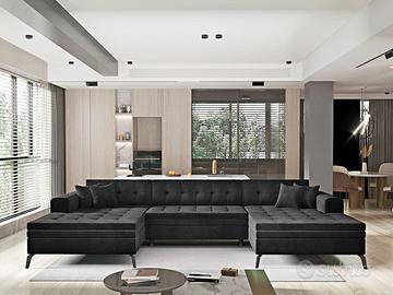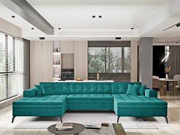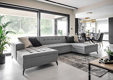 Il modello Massachusetts, divano angolare matrimoniale ad U, è una soluzione moderna e originalissima di stile e design. Questo divano angolare ad U è un modello contemporaneo che arrederà qualsiasi soggiorno. La sua linea semplice ed elegante è perfetta sia per interni moderni che classici. Grazie ai piedi alti in metallo la sua linea è slanciata e leggera nonostante le sue dimensioni. Estremamente confortevole, le sue ampie dimensioni garantiranno la comodità del riposo e la comodità d’uso come zona notte con dimensioni di 295×110 cm. L’apertura agevole consente di aprire facilmente e rapidamente il divano, che può essere trasformato in un ampio letto con un movimento della mano. Il divano letto angolare Massachusetts è progettato per adattarsi alle tendenze del momento e allo stesso tempo è resistente, ha una struttura solida ed è comodo da usare. L’elegante trapuntatura sull’intero mobile aggiunge stile e i piedini neri si adattano perfettamente a qualsiasi interno. Il divano letto angolare Massachusetts è disponibile in un’ampia gamma di tessuti e colori. Massachusetts è il nuovo modello angolare ad U del divano Patagonia, già molto apprezzato per colori originalità e comfort. Pur non essendo dotato di box contenitore, il modello Massachusetts è un divano angolare robustissimo e di ottima qualità dal peso di 181 Kg! Sottolineiamo che il rivestimento della funzione letto che fuoriesce può essere di colore diverso da quello evidenziato in foto e comunque non è in tinta ed è differente dalla combinazione di colore del divano che si sceglie.