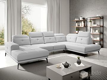 Portogallo è un nuovo modello di divano angolare matrimoniale ad U molto raffinato tra i divani angolari ad U, dal tipico stile nordico. Si tratta di un divano molto accogliente e confortevole, moderno e di design. Grandi dimensioni e modernità sono le caratteristiche che contraddistinguono il divano angolare Portogallo. Il comfort offerto è dovuto ai sedili imbottiti con schiuma HR altamente elastica con maggiore elasticità e durata. Portogallo ha poggiatesta e schienali che possono essere facilmente regolati per ottenere la posizione più comoda del corpo. Le caratteristiche gambe nere dalla forma interessante conferiscono originalità e il comodo bracciolo consente un riposo confortevole. I piedi del modello Portogallo sono alti 18 cm, il che lo rende facile da tenere pulito sotto l’angolo. Le dimensioni del prodotto sono: 350 x 201 x 107 cm. Inoltre, i rivestimenti disponibili sono in molti colori interessanti. Il divano ad angolo Portogallo ha una forma interessante e funzioni ingegnose, e le sue caratteristiche distintive sono anche l’elegante trapuntatura e il solido materiale di rivestimento. Portogallo è un divano angolare robustissimo e di ottima qualità dal peso di 243 Kg!
