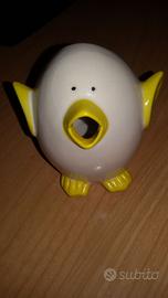 Vendo delizioso separauovo a forma di pulcino in ceramica dipinta a mano MAI USATO. L'originalità è data dall'ingegnoso sistema secondo cui il tuorlo rimane dentro il corpo del pulcino, mentre l'albume esce dal becco, inclinando il pulcino in avanti. Il retro del pulcino è aperto per potervi versare l'uovo, una volta aperto. Colore: bianco e giallo. Ottimo anche come idea regalo.