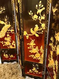 Bellissimo paravento in lacca nera e rossa, con figure in rilievo tutte in madreperla e decorazioni in oro (vedi foto). Provenienza Cina, con tecnica di decorazione Coromandel, epoca circa primi '900. Buono stato di conservazione, misure H 183cm, L 185cm, ogni anta misura 45cm, spessore circa 5cm. Contattare solo se interessati