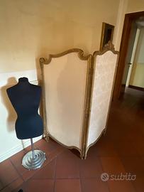 Separè del 1900 dorato in legno intagliato e tessuto in ottimo stato color ecrù Misura pannelli singoli 68 cm x 153 cm Regalo anche manichino se serve