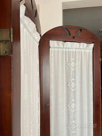 Separe’ composto da n 4 pannelli (50x180) legno massello e cotone/lino ricamato. Arte povera anni 1990 circa.