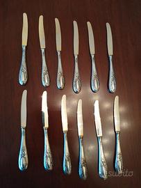 Classico set d'epoc per dessert completo di 12 forchette e 12 coltelli per frutta e dessert con manici in argento massiccio, lame e rebbi con finitura Vermeil (argentati e dorati) per proteggere il metallo dall'acidità degli alimenti. Il manico presenta una lavorzione a volute e motivi floreali in rilievo ( neoclassico o Luigi xv) con uno scudo centrale liscio che spesso veniva usato per incidere le iniziali di famiglia. Ogni pezzo riporta la sigla 800 che indica il titolo della lega di argento composto per 80% di argento puro. Epoca: anni '30-40 Lunghezza forchette cm 16, coltelli cm 18 Valutazione della AI: 450-750 €