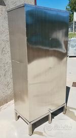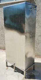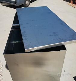 Serbatoio interamente realizzato in Acciaio Inox AISI304 in lamiera spessore 1,5 mm. per deposito acqua ad uso sanitario dimensione mm. 900x500 h.1800 capacità circa 800 lt. completo di nr. 4 manicotti filetti per l'allaccio all'impianto e scarico. Comprensivo di apposito telaio di supporto in angolare sp. 5 mm per il rialzo di 200 mm. da terra e coperchio estraibile.