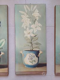 Ogni quadro raffigura un diverso tipo di fiore in un vaso decorato, tra cui ortensie, gigli e iris.