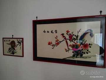 4 quadri 21x30cm + 1 quadro 43x69cm in stoffa disegni orientali incorniciati con vetro