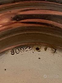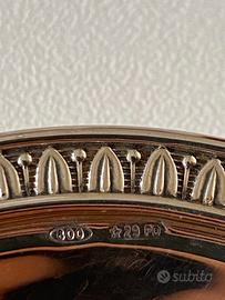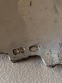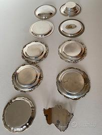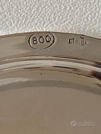Serie di 9 piattini in argento 800 di varia forma e decoro + 1 segna bottiglia "Wisky" con catenella in argento 800. Misure: tutti diametro cm. 8 (1 piattino diametro cm. 7); segna bottiglia: largh. cm. 6, h. cm. 4. Peso totale: gr. 147
