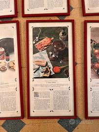 Vendo collezione completa di 8 quadri “Piatti di tutto il mondo”, ognuno raffigura una ricetta tipica (Germania, Svizzera, Spagna, Italia, Inghilterra, India, Russia, Cina). Cornici rosse originali, vetro e stampa in ottime condizioni, perfetti come decorazione da cucina o locale vintage.