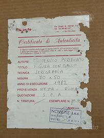 Serigrafia incorniciata a firma Domenico Purificato “Figura con Gallo” 70x50 anno di esecuzione 1982 ottime condizioni generali. Difetti di umidità sul passpartout ma la stampa non presenta macchie significative .