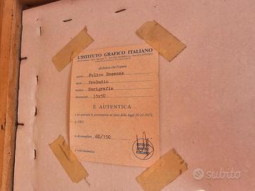 Serigrafia originale dell’artista Felice Bossone, titolo Preludio, completa di certificato di autenticità. Opera numerata 60/150, firmata a mano dall’artista. Dimensioni: 30x50 cm Tecnica: serigrafia Condizioni: perfette Ideale per arredamento moderno o collezione di arte contemporanea. Disponibile per visione o ulteriori foto su richiesta.
