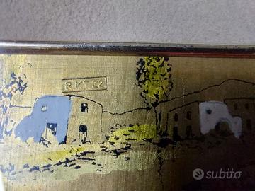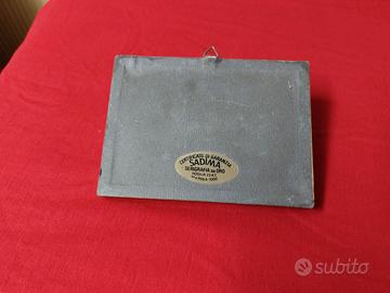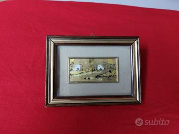 quadretto in serigrafia su foglia oro 22 karati titolo oro 999.9/1000 piccolo paesaggio fatto a mano dimensione cornice con vetro cm 10x13 dimensione foglia interna cm 4x7 bollino garanzia ditta sadima oro serigrafie su foglia