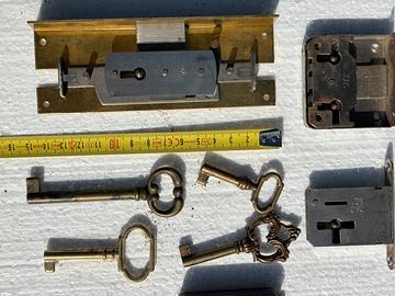 Disponibilità di circa 800 serrature di varie misure per cassetti e armadi, chiavi in ottone di vari stili e misure e mascherine in ottone Vendo in blocco valuto offerte sensate