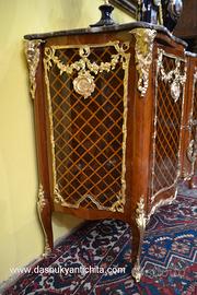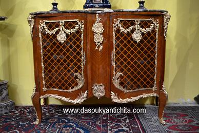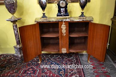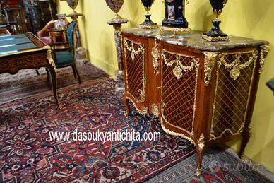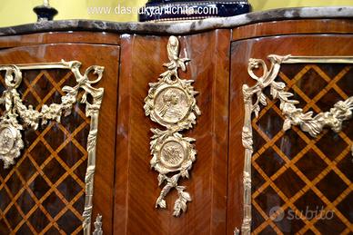 Imponente credenza – servante stile Transizione a due sportelli in noce massello , lastronato in bois de rose a spina di pesce e rifinito da un raffinato intarsio geometrico a rombi in legno di viola , gambe leggermente arcuate. Minuziosamente rivestita da una ricca applicazione di bronzi cesellati e dorati di altissima qualità con festoni floreali , ghirlande , medaglioni con simboli neoclassici e quattro teste di ariete inserite nei montanti angolari. Il mobile è sormontato da un massiccio piano in marmo venato , sagomato che segue perfettamente la linea mossa no fino ai piedi. Dimensioni : Larghezza 146 cm. ( piano del marmo 141 cm. ) Profondità 52 cm. Altezza 103 cm. Chi fosse interessato a una visita virtuale della nostra galleria può accedere ai motori di ricerca, inserendo il nominativo " Dasouky antichita' " Per informazioni contattateci ai seguenti numeri Cell. - Cell. EURO 1.100,00 SPEDIZIONI IN TUTTA EUROPA CON CORRIERE ESPRESSO