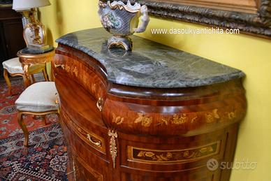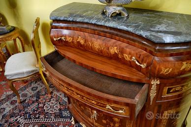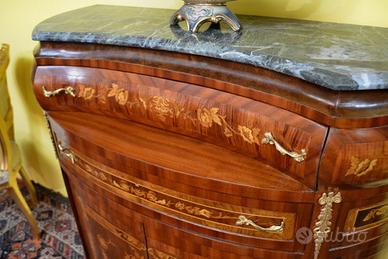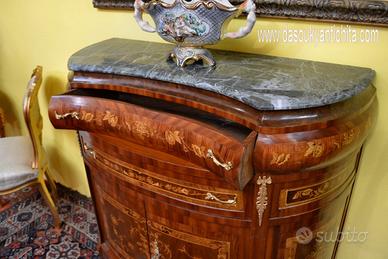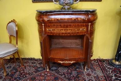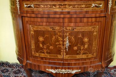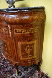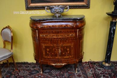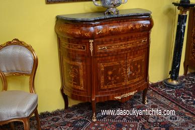 Servante mezzo giro stile Lugi XV i , legno massello , lastronata in noce e radica con intarsi a motivi floreali e geometrici in legni esotici , che aggiungono un tocco di eleganza.