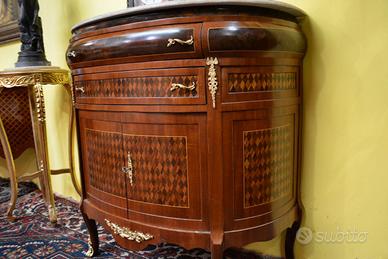 Credenza- servante stile Luigi XV a mezzo giro provvista di due sportelli e due sportelli frontali, in noce massello , caratterizzata da un’elegante impiallacciatura a rombi realizzato con diverse tonalità di legno, crea un contrasto visivo che attira immediatamente l’attenzione, gambe sagomate a sciabola, arricchito da bronzi cesellati e dorati, piano in marmo sagomato .