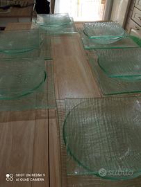 servito di piatti da sei portate in vetro cangiante in verde acqua , come nuovo ,usato una volta piatti grandi quadrati , scodelle tonde e piattini quadrati , vetro lavorato , molto bello e un po' diverso dai soliti piatti vetro doppio