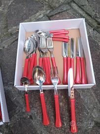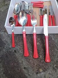Vendo tutto completo ed in perfetto stato, servito di posate completo in puro acciaio inox 18c, marchio Abert made in Italy, servito composto da 6 cucchiai 6 cucchiaini 6 forchette e 6 coltelli color rosso e decoro come foto, tutti i prodotti idonei anche alla lavastoviglie...