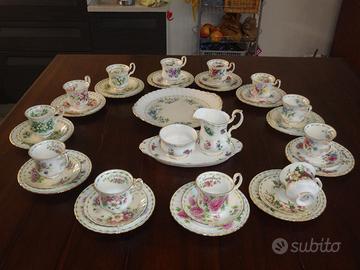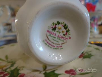 Set di tazze e piattini vintage Royal Albert Flowers of the Month, serie in pregiata porcellana Bone China 1970, con profili in oro.