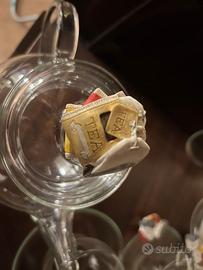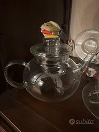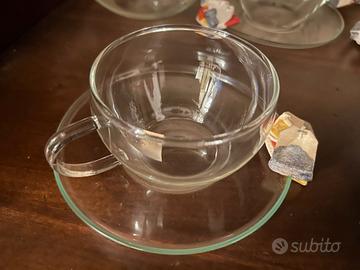6 tazze vetro + 6 Piattini con inserto Bustine di the e bricco con tappo. mai usato