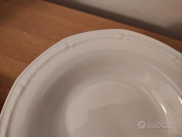 Vendo n°5 piatti fondi + n° 5 piatti piani in porcellana bianca: € 9. Il piatto fondo presenta una lavorazione lungo il bordo, il piatto piano è liscio.