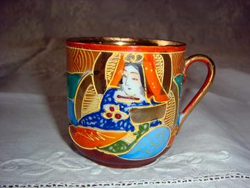Nel caso di specie, trattasi di servizio stile di Satsuma ma assenza del motivo a draghi (anni 50), particolarità della porcellana con tutti gli interni in oro, così come i manici e gli intarsi delle figure. Il servizio è da 4 .