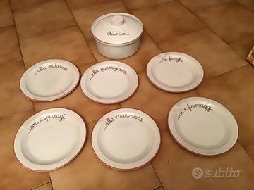 2. Risottiera e 6 piatti piani (diametro 24 cm) con scritte, "le cose belle - i multiforno da tavola in vera porcellana";