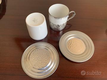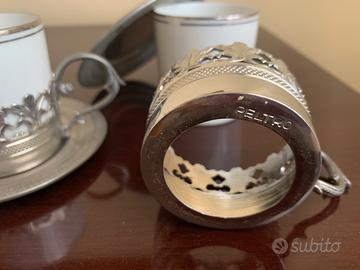 Servizio vintage anni 60 completo: 12 tazzine di ceramica Bavaria - Germania bianche + 12 portatazzine e piattini di peltro trattato per non annerire. Anche separabili 6+6 (se il servizio da 12 è troppo). Accetto offerte.