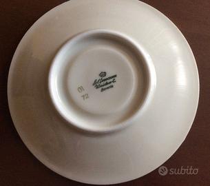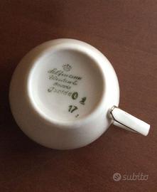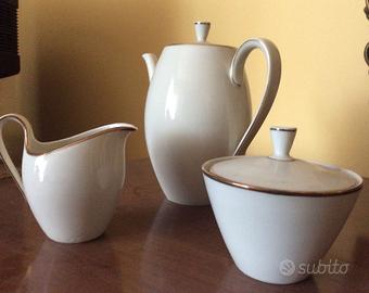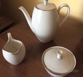 Servizio completo di 12 tazzine da caffè con piattino, 1 zuccheriera, 1 bricco latte, 1 bricco caffè. Porcellana WEIDEN BAVARIA ISOLDE, bianca smalto oro, serie numerata. Ottime condizioni.