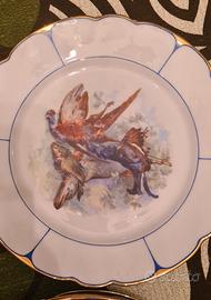 Ogni piatto presenta una scena differente e dettagliata, tra cui fagiani, cervi, cacciagione varia e una rara rappresentazione con aragosta.