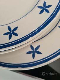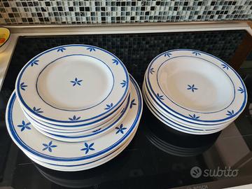 Vendo splendido servizio di piatti in terracotta smaltata prodotto dalla manifattura italiana La Primula per IKEA (serie storica Blå Klint), originale degli anni '90/2000. Il set è composto da 16 pezzi: • 5 Piatti Piani • 5 Piatti Fondi (Scodelle) • 6 Piatti Frutta/Dessert Caratteristiche e Condizioni: I piatti presentano il classico decoro a fiorellini blu navy su fondo bianco panna. Trattandosi di ceramica vintage in terracotta, i pezzi mostrano i segni del tempo che ne esaltano il fascino rustico: sono presenti le tipiche sottili venature dello smalto (effetto craquelé) e alcune piccole mancanze/sbeccature sui bordi dovute all'utilizzo quotidiano. Perfetti per chi vuole completare un servizio esistente o per chi ama una tavola dal sapore vissuto e autentico, in perfetto stile Country o Shabby Chic. Disponibile per consegna a mano in zona Chiavenna.